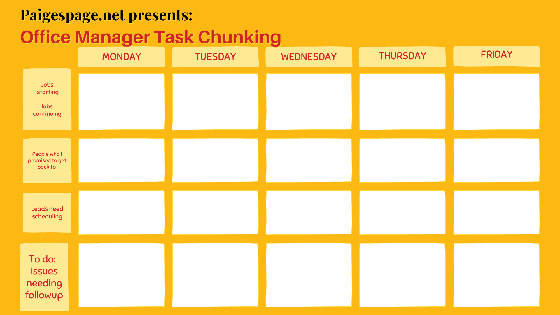 [/et_pb_text][/et_pb_column][/et_pb_row][et_pb_row column_structure=”1_3,1_3,1_3″ _builder_version=”3.25″ animation_style=”zoom” animation_intensity_zoom=”10%”][et_pb_column type=”1_3″ _builder_version=”3.25″ custom_padding=”|||” custom_padding__hover=”|||”][et_pb_blurb title=”Office Manager Task Chunking Calendar” url_new_window=”on” image=”https://paigenejame.com/wp-content/uploads/2023/11/5a98a-office-manager-weekly-calendar-3.png” alt=”Office Manager weekly task calendar Monday-Friday” icon_placement=”left” image_max_width_last_edited=”off|desktop” admin_label=”Juice Item” _builder_version=”4.9.7″ _dynamic_attributes=”link_option_url” header_font=”Oswald|||on|||||” header_letter_spacing=”2px” header_line_height=”1.7em” body_font=”Open Sans|600|||||||” link_option_url=”@ET-DC@eyJkeW5hbWljIjp0cnVlLCJjb250ZW50IjoicG9zdF9saW5rX3VybF9hdHRhY2htZW50Iiwic2V0dGluZ3MiOnsicG9zdF9pZCI6Ijc4NTcifX0=@” hover_enabled=”0″ border_radii=”on|13px|13px|13px|13px” border_width_all=”1px” border_color_all=”#DBCE43″ border_color_all_image=”rgba(51,51,51,0)” border_style_all_image=”none” sticky_enabled=”0″]